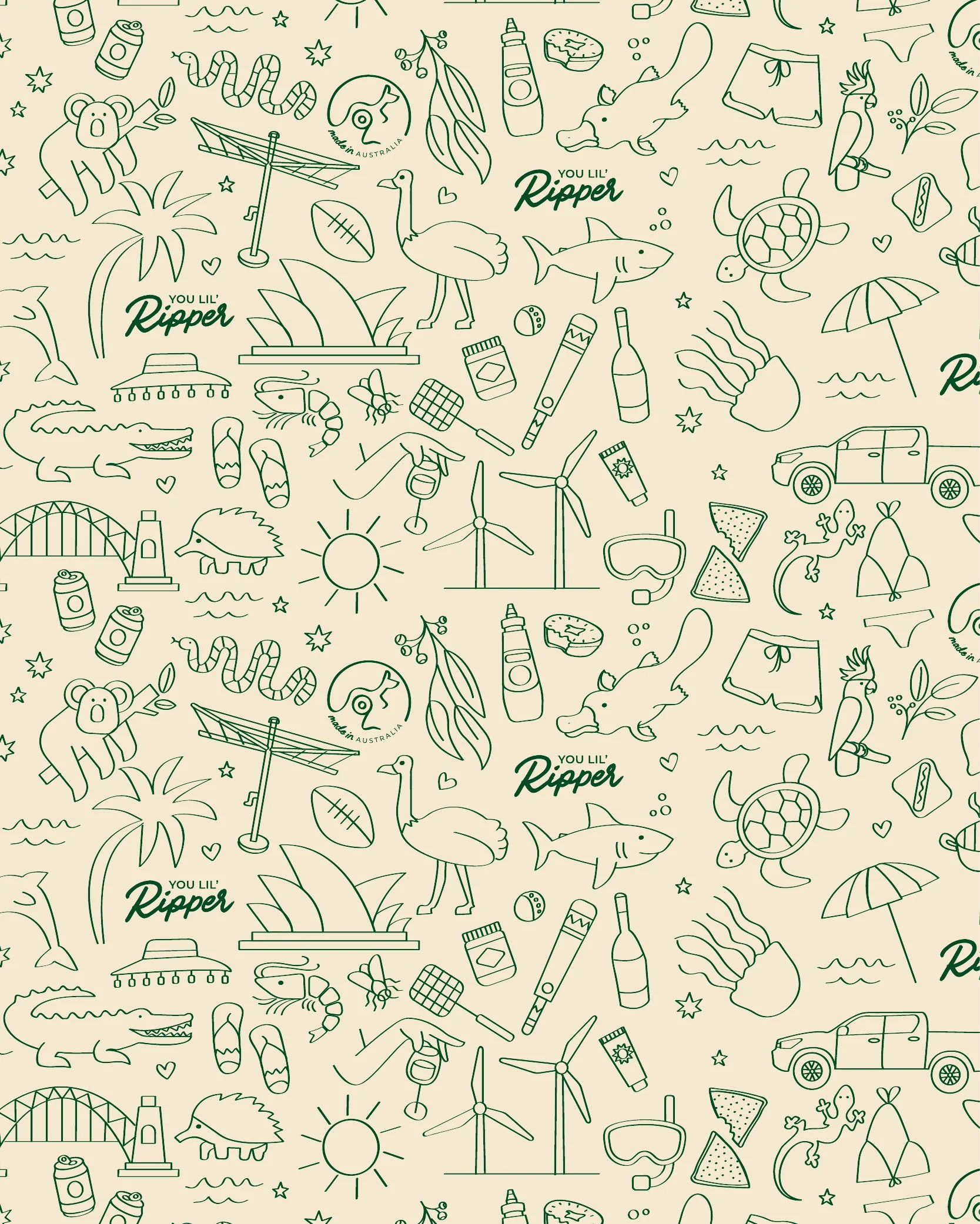 Packaging design presented the project's biggest hurdle. The original vision featured commissioned works by Australian artists — a natural extension of the brand's made-in-Australia commitment. Fully developed concepts had to be abandoned when local printing limitations ruled out full-colour packaging. Rather than compromise, the constraint became the brief. The solution was a richly detailed two-colour illustration, hand-drawn and loaded with iconic Australian imagery: fairy bread, Hills Hoists, utes, koalas, surfboards. Applied across both the toilet paper wrap and tissue box, it became one of the brand's most distinctive assets.