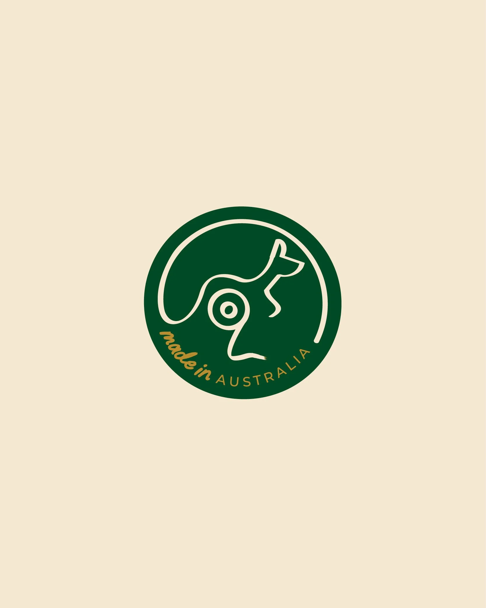 Green and gold were the natural foundation, deepened to a lush, rich tone and softened with cream to sit slightly more premium without losing approachability. The primary logo is typographic — brushstroke letterforms that feel handcrafted and personal, grounding the brand in the local, authentic spirit at its core. Supporting the logotype is a custom brand icon: a single-line kangaroo with a toilet roll worked subtly into the tail, nodding to the official Australian Made symbol while feeling entirely ownable. The consistency between the brushstroke type and the loose, fluid linework of the illustration ties the whole identity together.