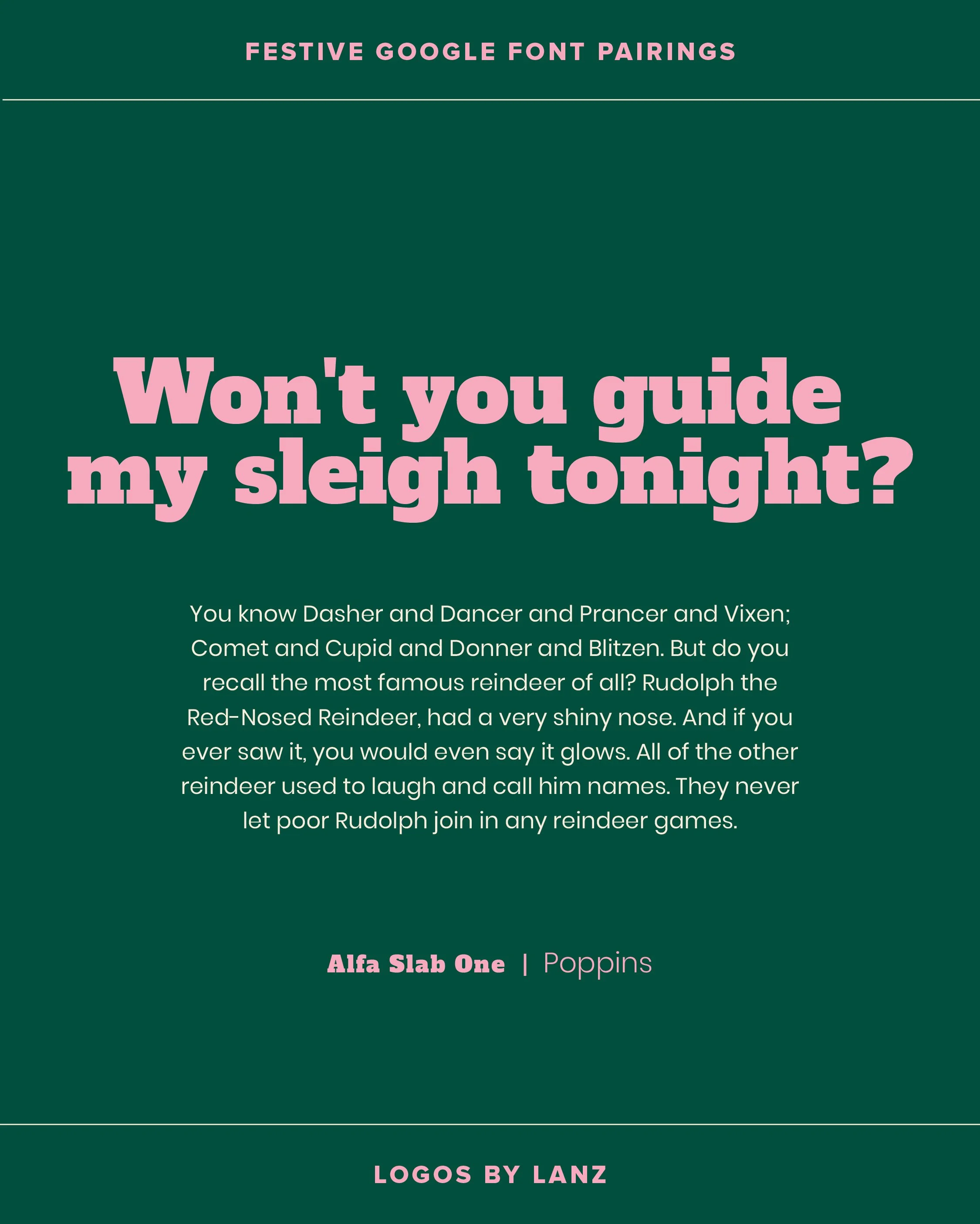 A slab serif creates a modern and attention grabbing headline to give a unique and energetic feel to your Christmas designs. Again, I recommend pairing a serif headline with a clean and minimalist body copy font. Poppins is a go-to for me when I want my text to feel friendly and approachable - just what we need in the festive season!